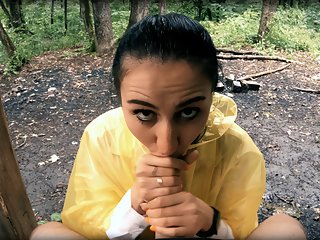 "Slutty Brunette in a yellow raincoat sucks me outdoors in the rain"